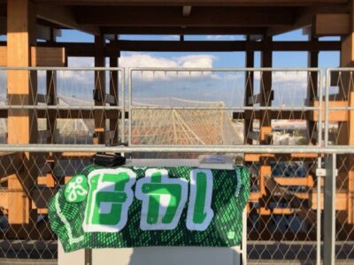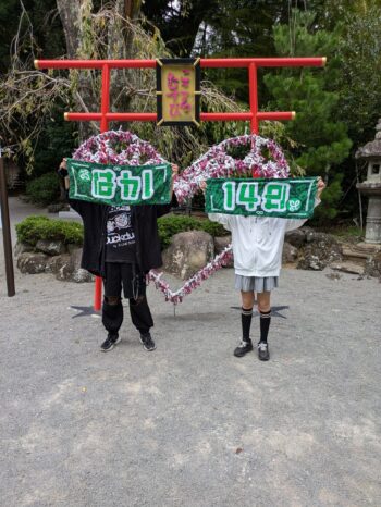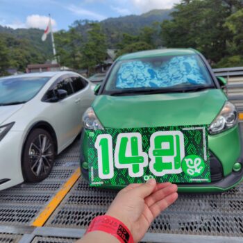 出雲大社に行って、神様にも見せビラビラかしてきました!(車の後方にかすかに見えるのが本殿…かな?)参拝は、もちろん正装のバカTシャツです!出雲に向かう途中、四国4県も回ってきたので、かなり多くの人に見せビラビラかせたと思います。ところで和実さん、そろそろこのバンド外した方がいいですかね?