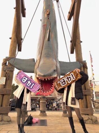 大好きな私のおねーちゃん伊勢崎エリザと大阪に吊るされてる大きなサメさんの前でじょーずに見せビラビラかしてきました!