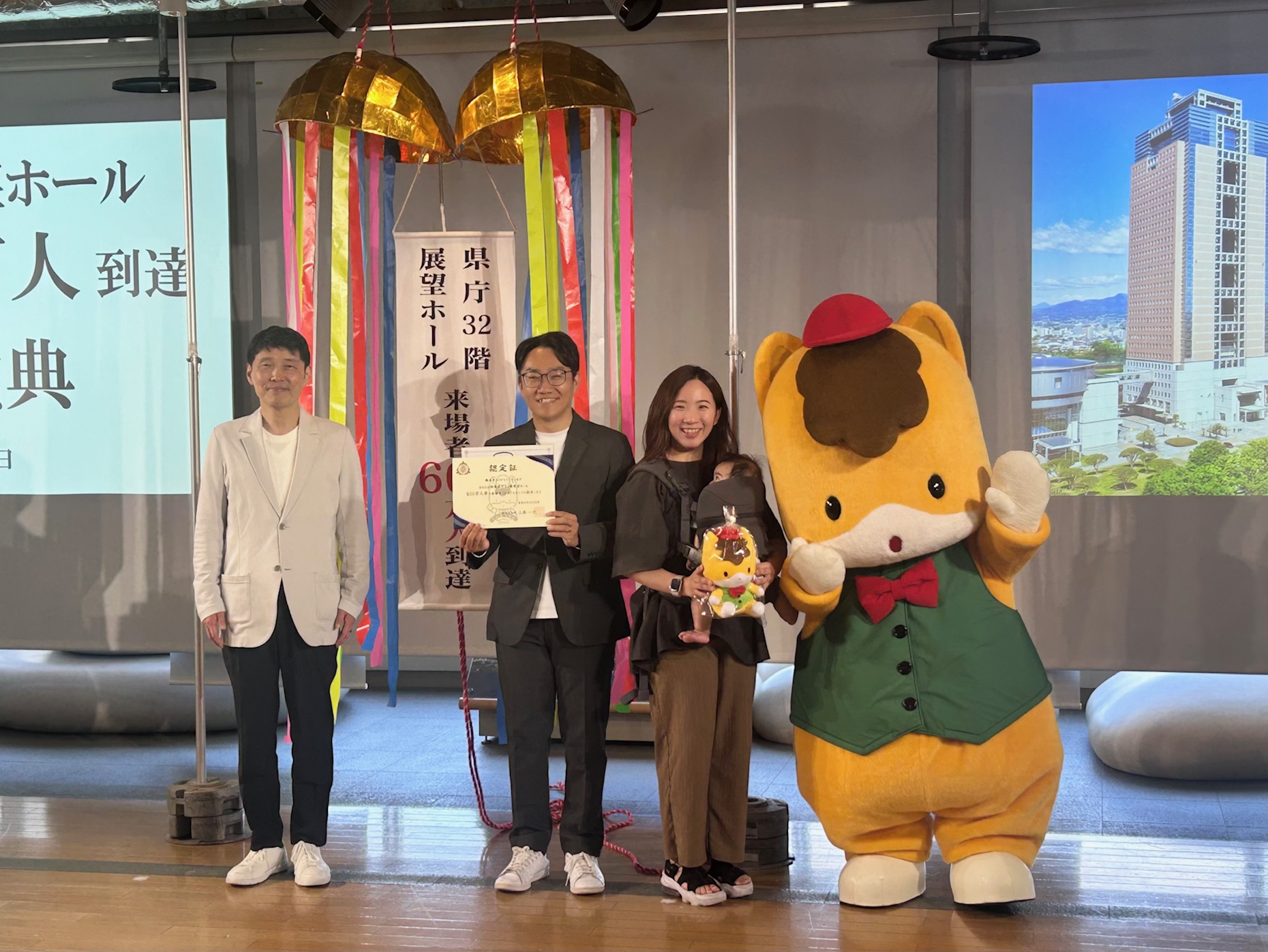 群馬県庁32階の展望ホールが28日に来場者600万人の節目を迎え、600万人目の来場者となった前橋市内の家族に認定証が贈られました。