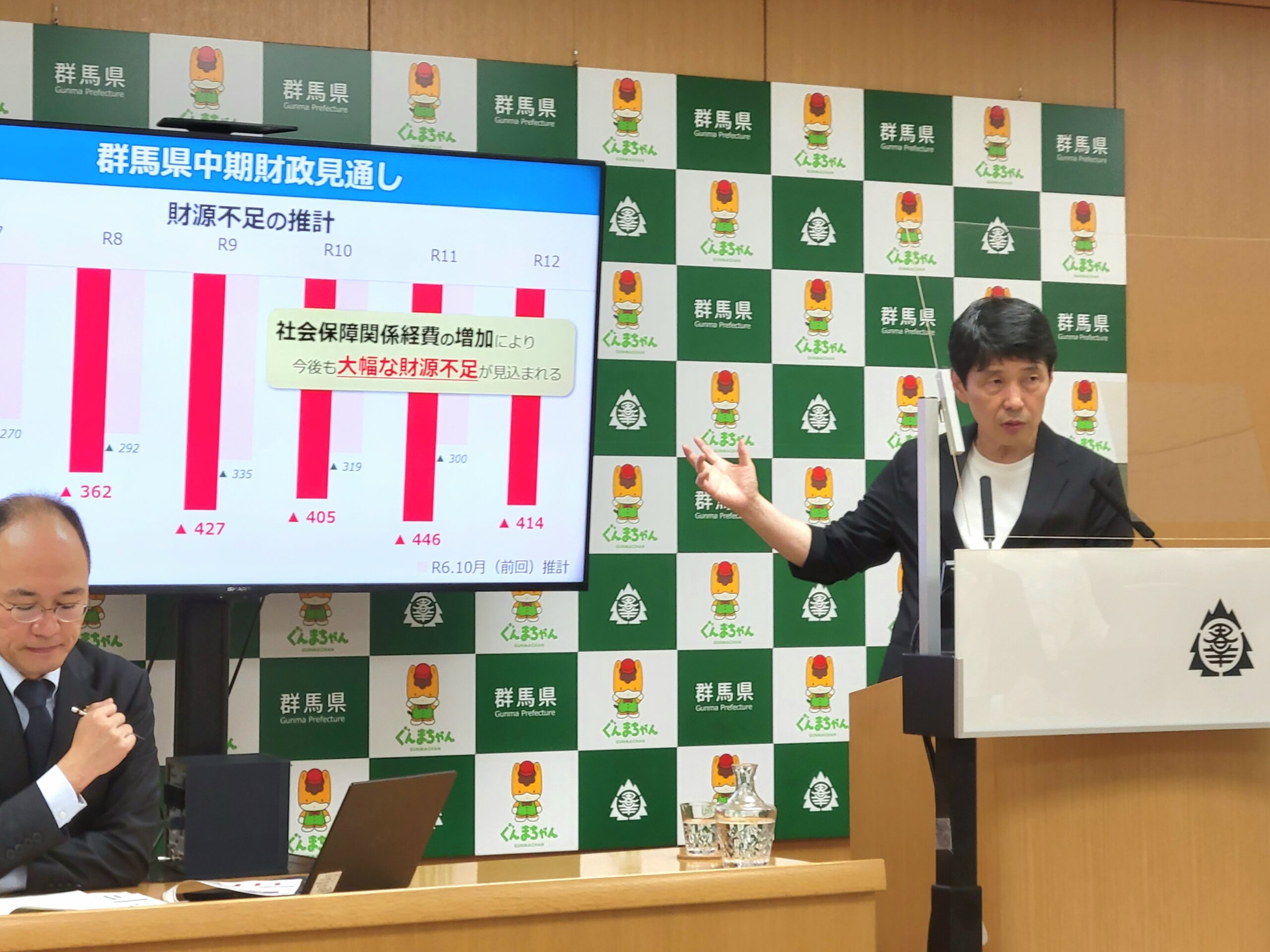 群馬県は16日、中期財政見通しを発表し、少子高齢化による社会保障関係経費の増加などで大幅な財源不足が続き、積立基金の残高が2028年度に枯渇、一方、この年度から県債残高は増加に転じると推計しました。去年発表した推計でも2028年の基金枯渇を見通していましたが、県債残高の増加の見通しは今回からで厳しさがましました。