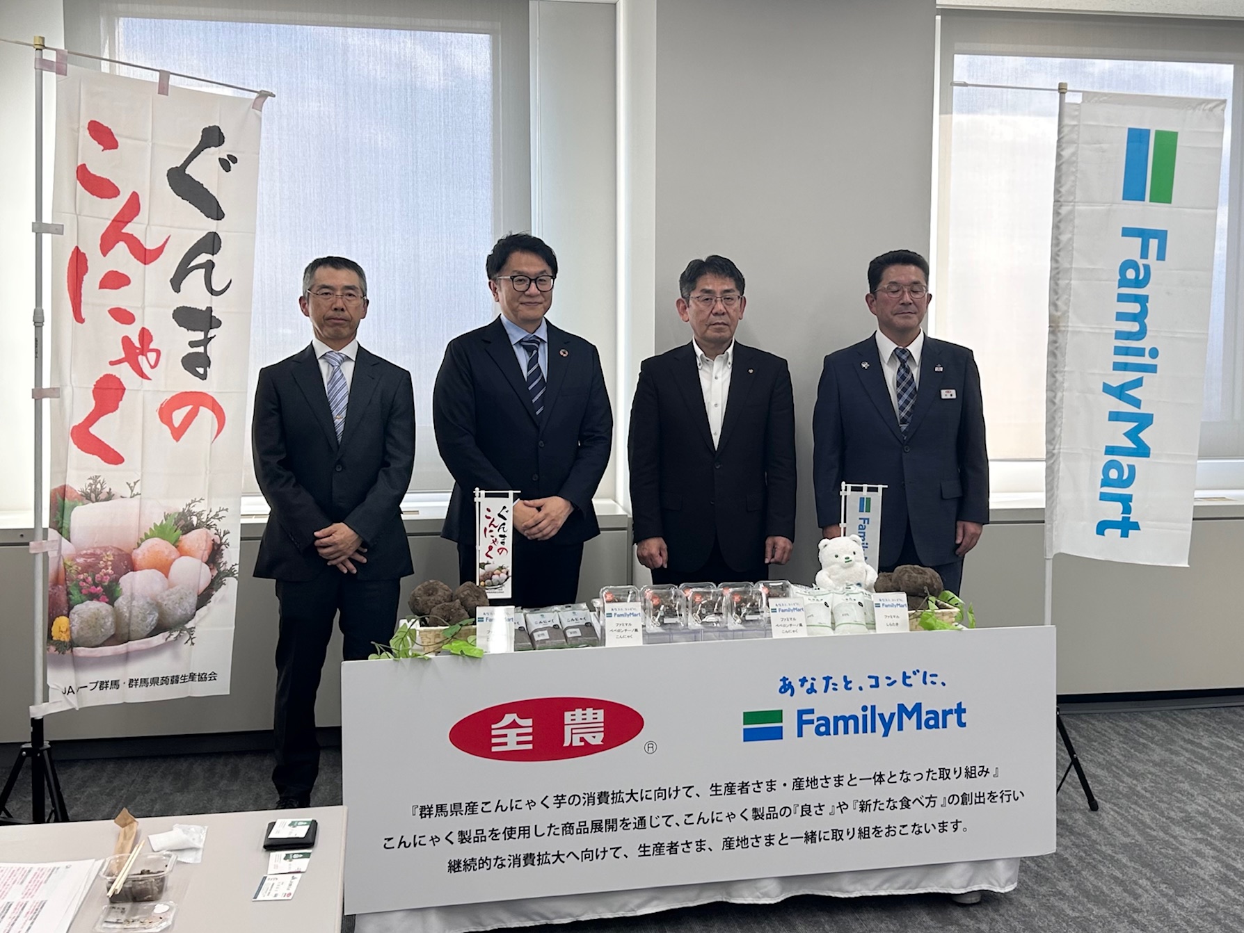 来月の販売に先立ち、ファミリーマート北日本地域の松平佳樹代表(写真左から2番目)らが20日、県庁を訪れ、新商品のお披露目と試食会を行いました。松平代表は「群馬県産こんにゃくの品質の高さを広く知っていただける機会になる」と話しました。これに対し、県農政部の岸篤志部長(写真左から3番目)は「農家のやる気、意欲、励みにつながる」と感謝の意を述べました。こんにゃくの消費が減り、価格が低迷していることを受けて、県は売り込みを図ろうと関係各所と連携し消費拡大に取り組んでいます。