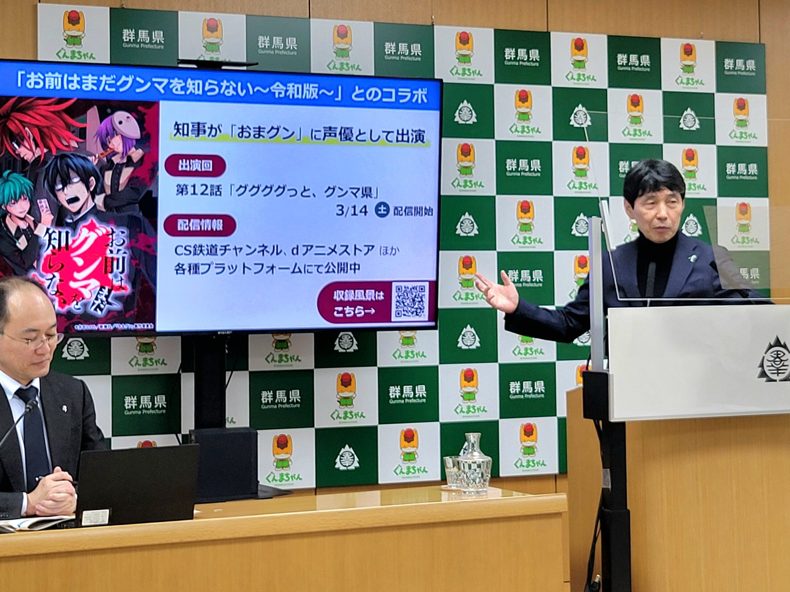知事は今月14日に配信予定の第12話「ググググっと、グンマ県」に「なぞの声」で出演するということです。山本知事は「(これまで)声優はやったことがないが、色んなものまね得意だから 意外と向いているんじゃないか」などと収録を振り返り、視聴を呼びかけました。
