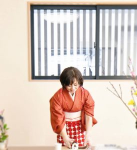 巻さんも着物を着用し、ひなまつりの時は食器も菱餅の色で揃えるなど
