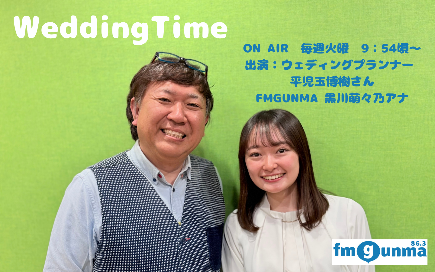 ■ ON AIR:毎週火曜 9:54頃~ ■ 出演:ウェディングプランナー 平児玉博樹さん、黒川萌々乃(FM GUNMAアナウンサー) ウェディングのプロ平児玉博樹さんが、最新のウェディング情報やお悩み相談など、 みなさんのハッピーウェディングのサポートをしていきます。