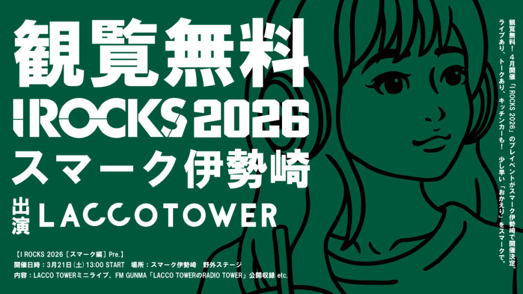 4/17(金)-19(日)メガネのイタガキ文化ホール伊勢崎で開催のLACCO TOWER主催フェス「I ROCKS 2026」に向けて、無料イベントをスマーク伊勢崎にて開催!
