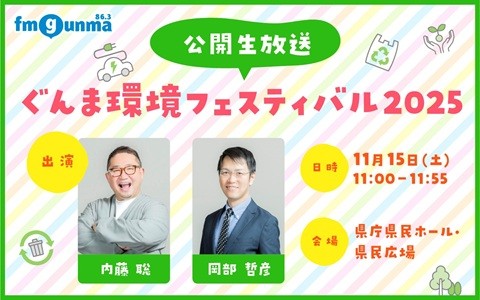 群馬県庁 県民広場で開催される「ぐんま環境フェスティバル」の会場からの公開生放送。会場にはエコな取り組みを体感できる様々なブースが大集結。番組では会場の様子や環境にやさしい取り組みなどをお伝えしていきます。出演は朝番組「WaiWaiGroovin’」パーソナリティの内藤聡さんと、夕方番組「newsONE」の岡部哲彦アナウンサーです。ぜひ群馬県庁に遊びに来てください!